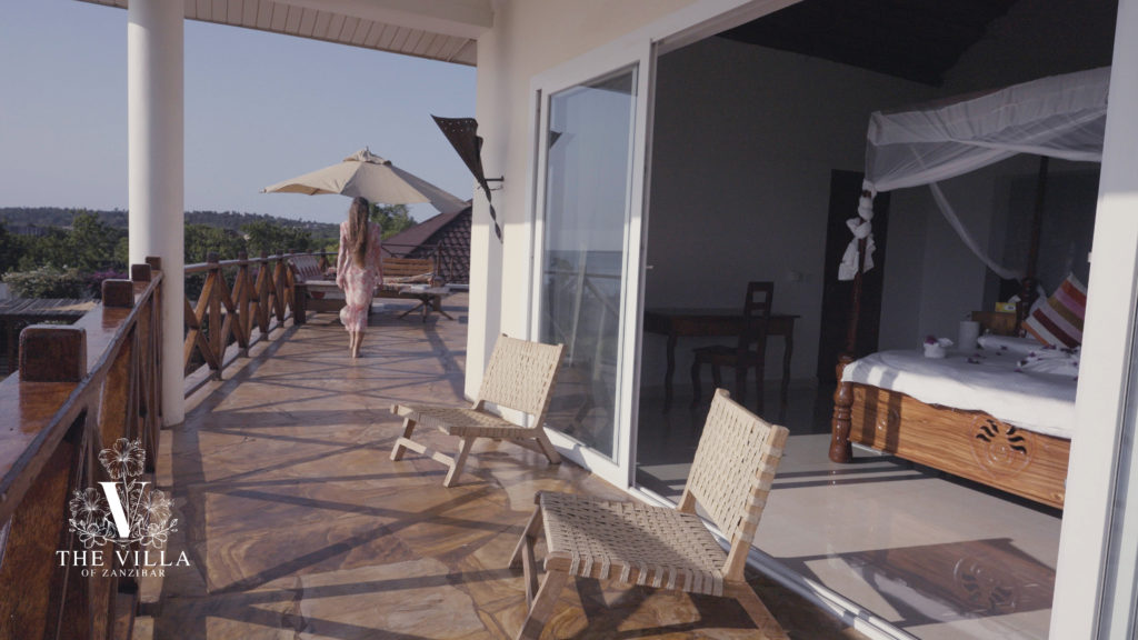 Set on the upper level of the villa, from here the view stretches freely toward the turquoise waters of the Indian Ocean, with open skies and uninterrupted views.